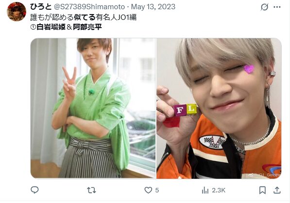 SnowManの阿部亮平さんと、JO1の白岩瑠姫さんが似ていると話題になっています。