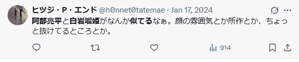 SNSで調べてみると阿部亮平さんと白岩瑠姫さんが似ているという意見が多くみられました。